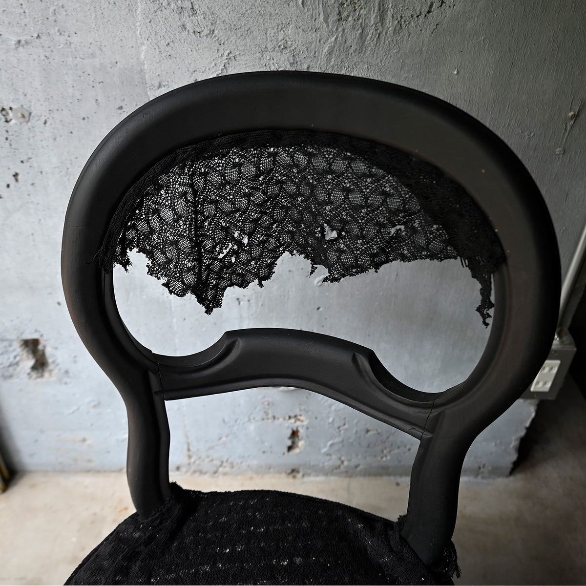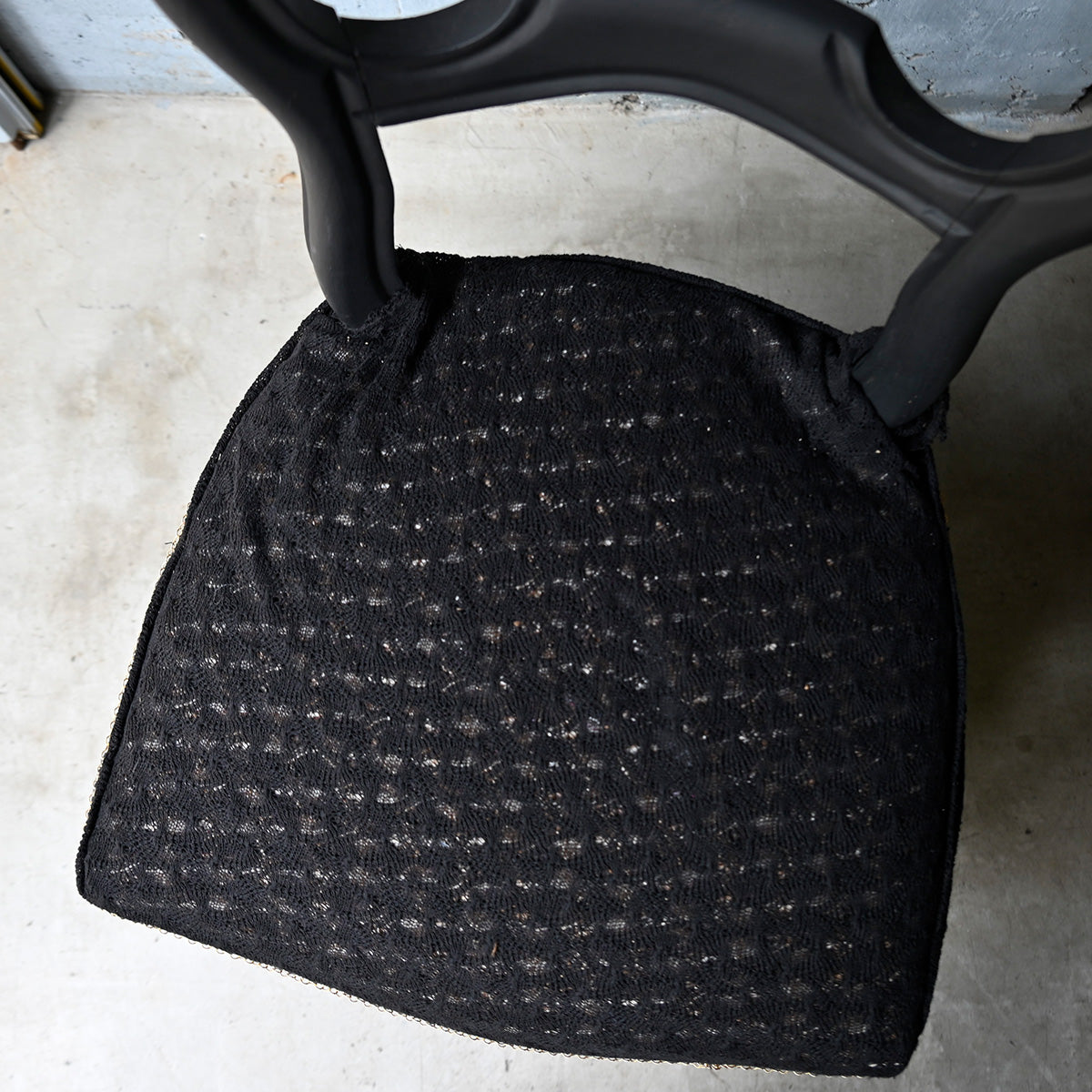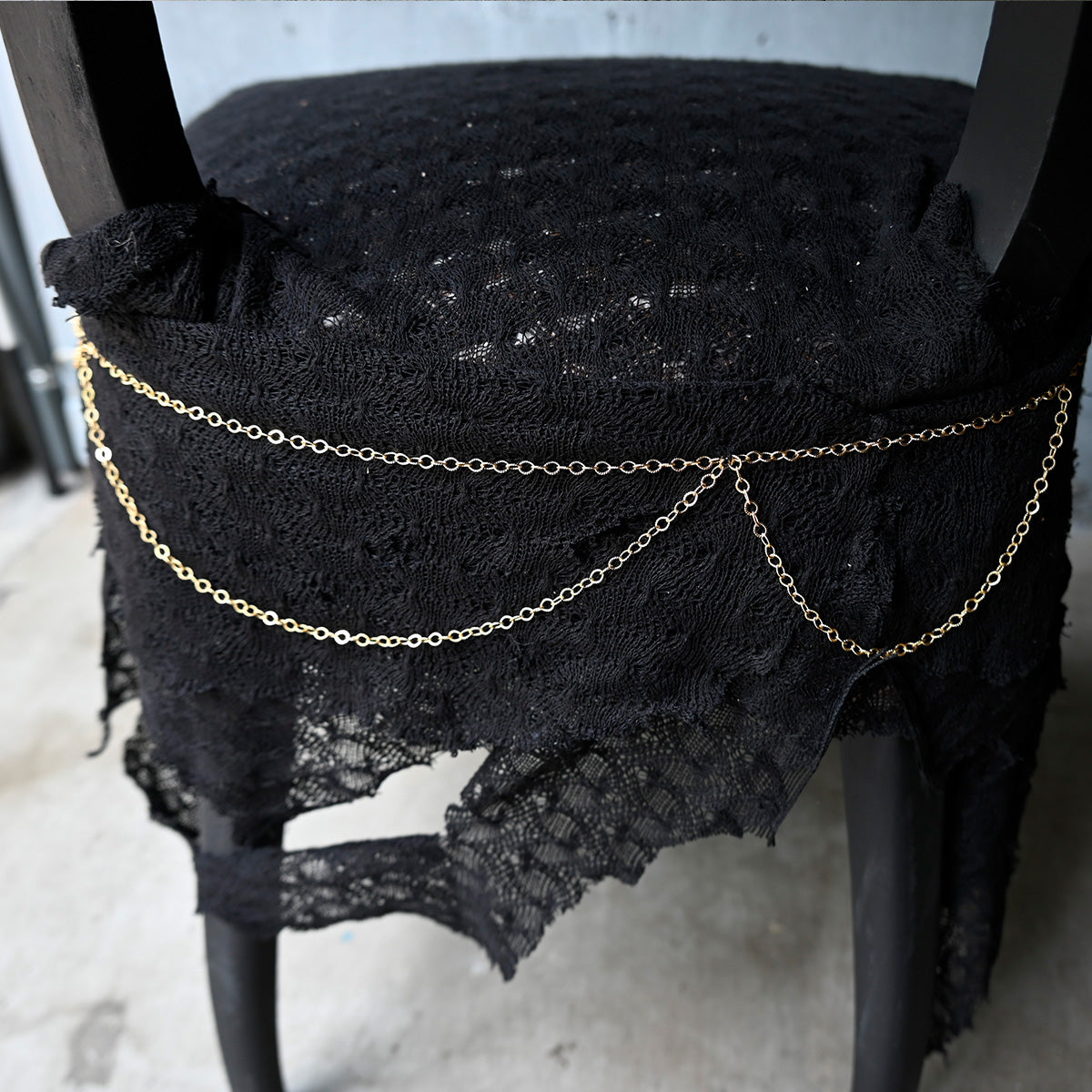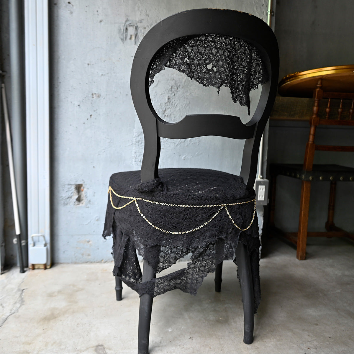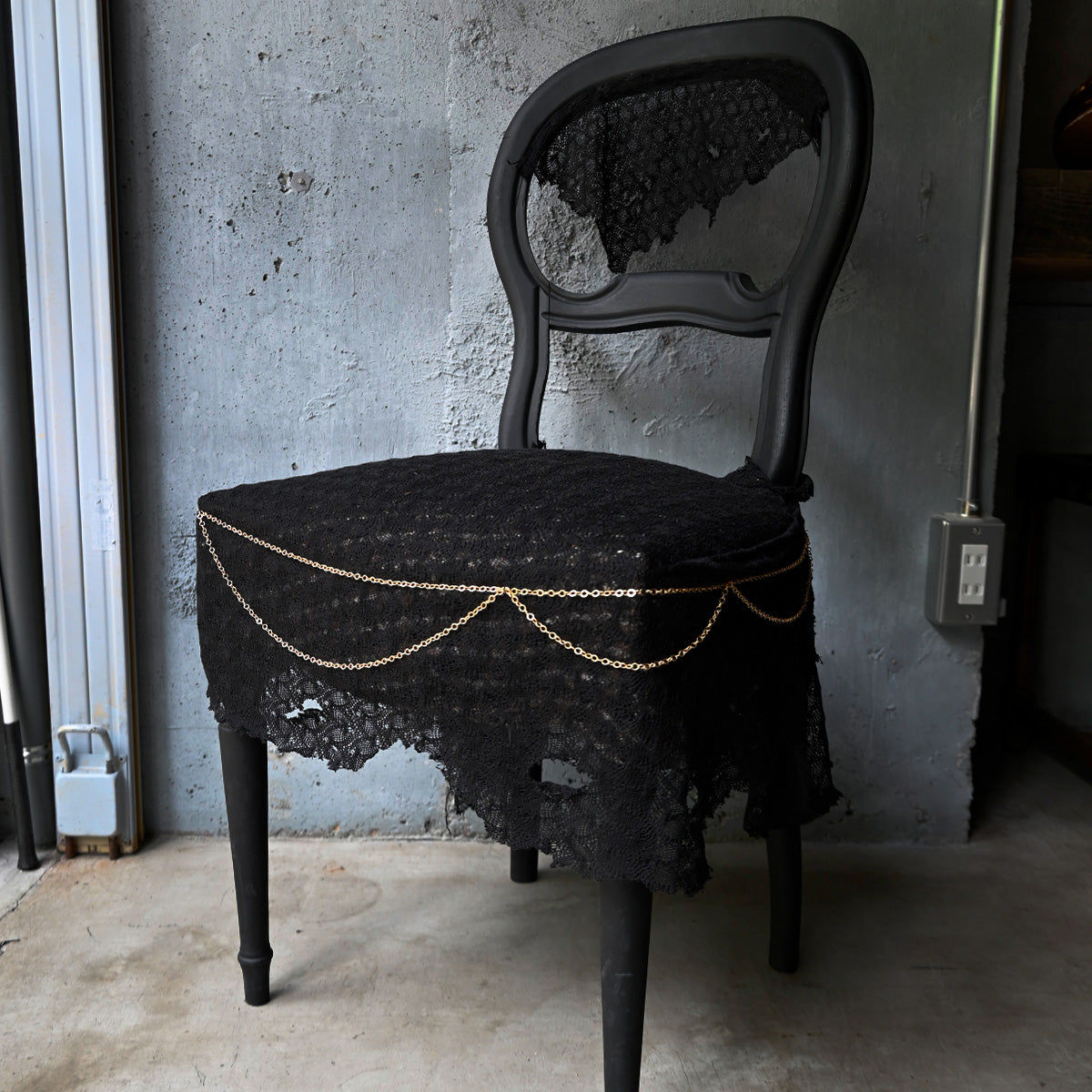 敗れ具合の生地、金彩チェーンが施されたアートチェア...