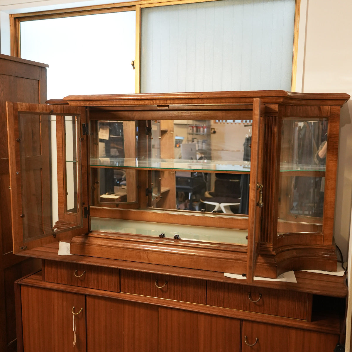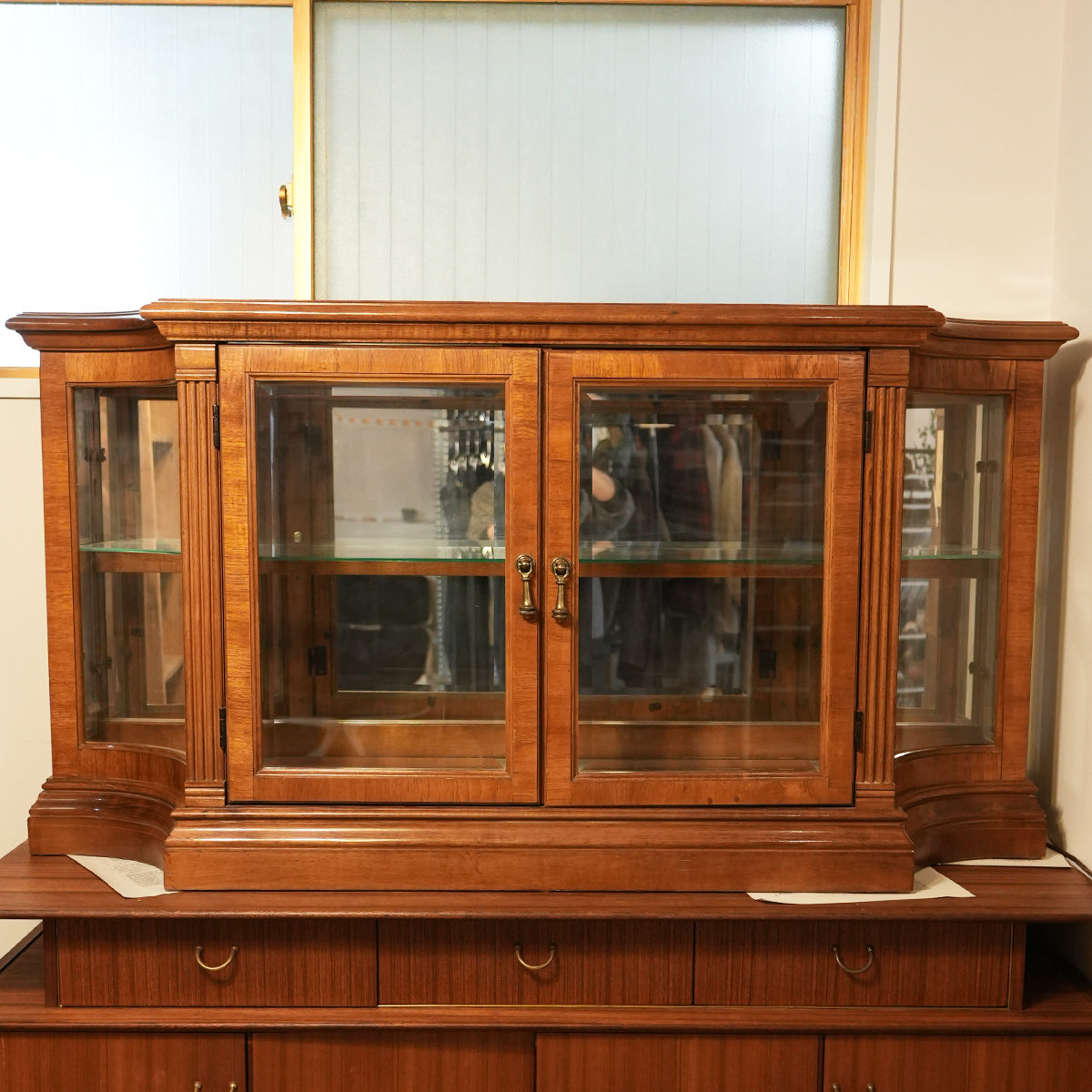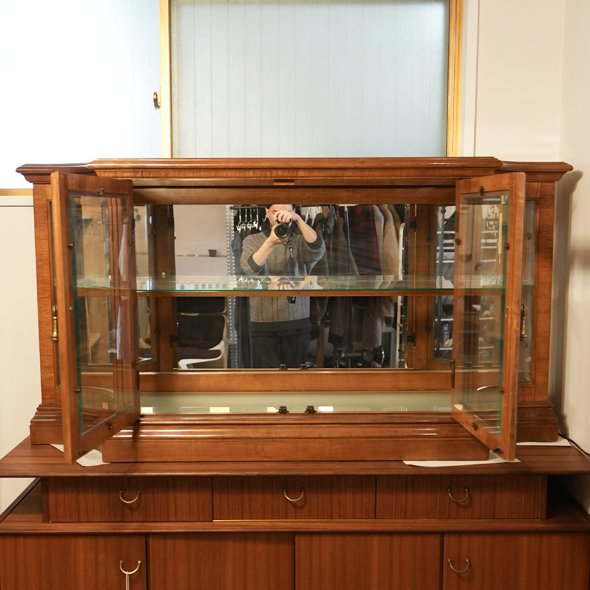 中央に大きなガラスの両開き戸、内部にはガラス棚が設置されています。