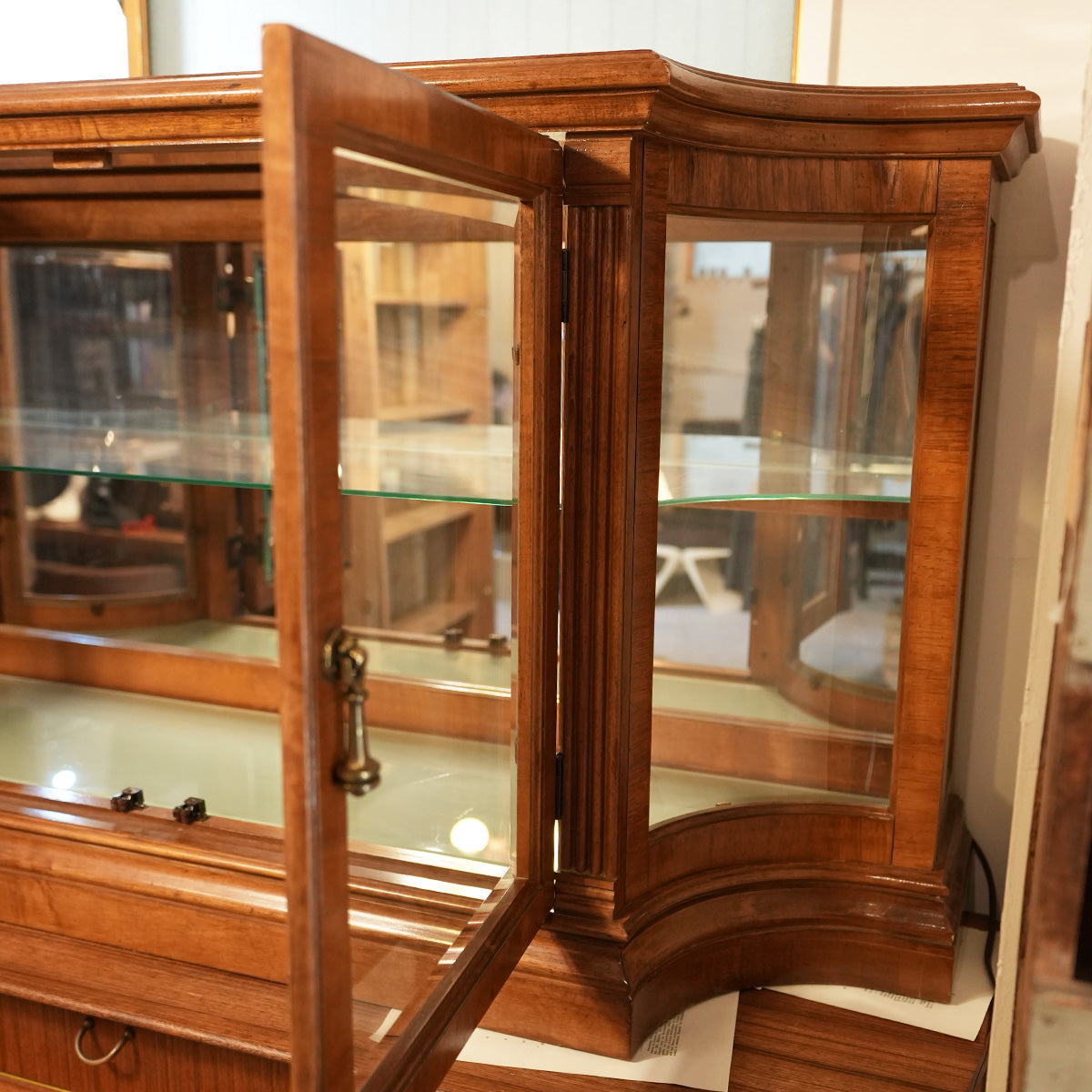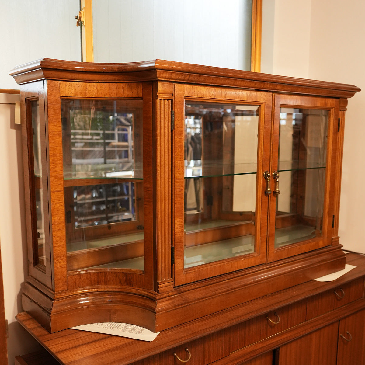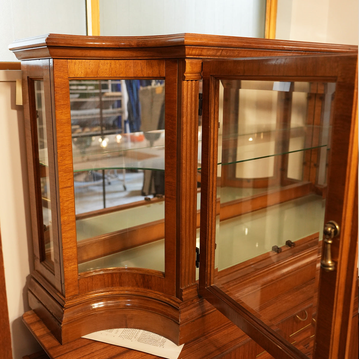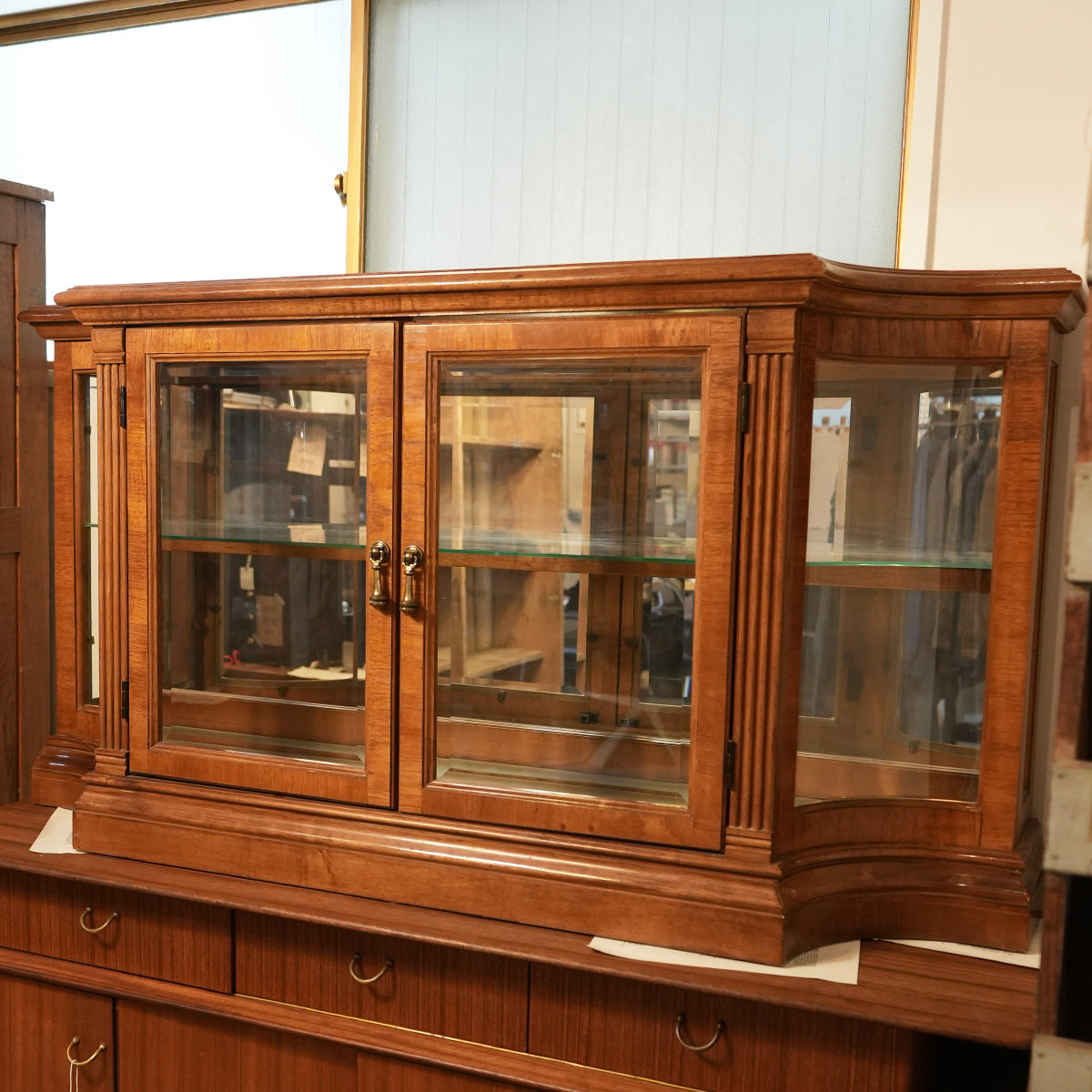中央に大きなガラスの両開き戸、内部にはガラス棚が設置されています。