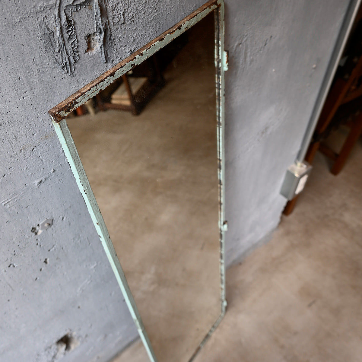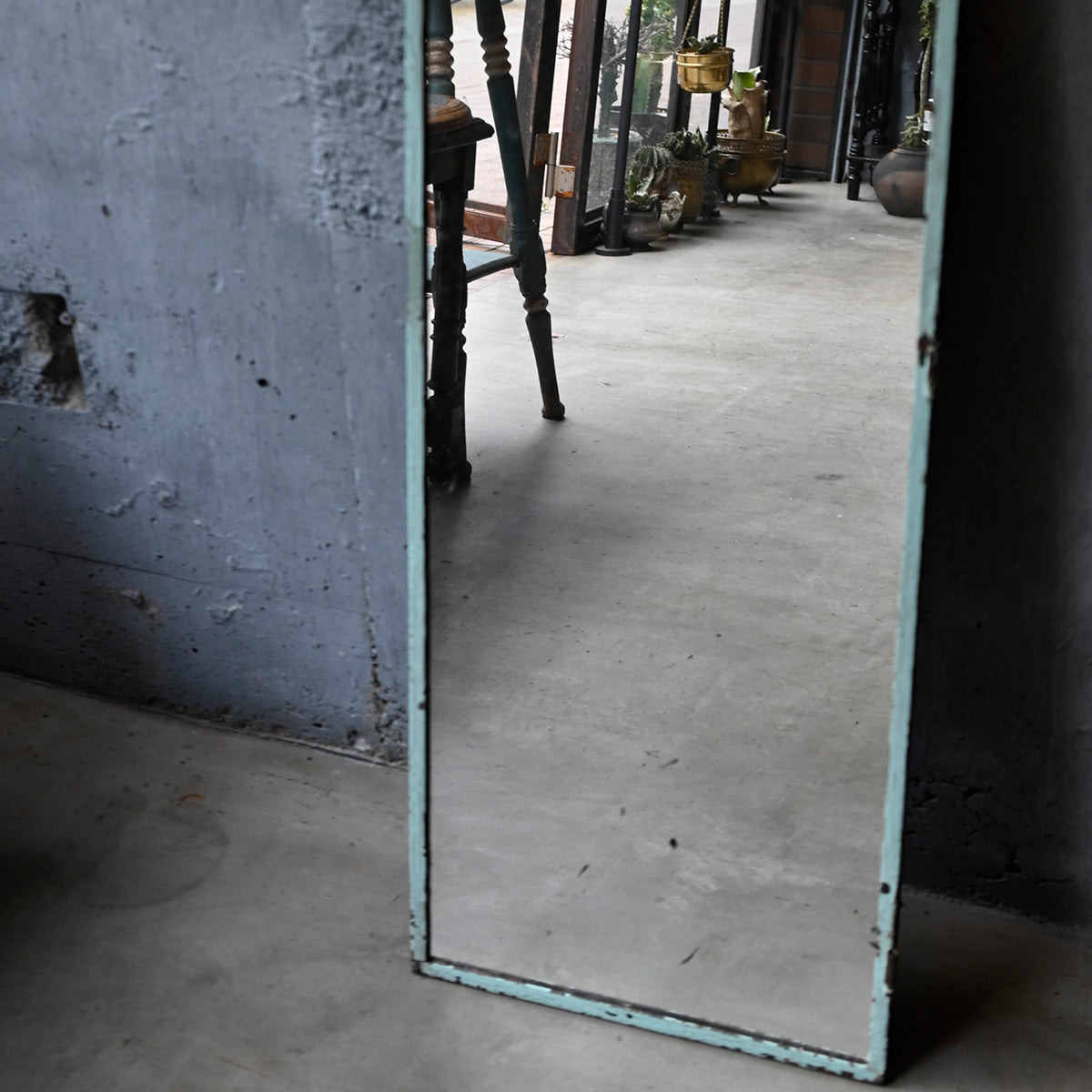 燻んだブルーがとても魅力な古びたアイアンミラー。インダストリアルを感じる